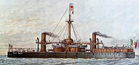 1876年に進水したイタリアの装甲艦デュイリオ Duilio 。際立って進歩した設計だった。砲塔には大口径の砲が装備されており、これは他の国々も即座に追随した。