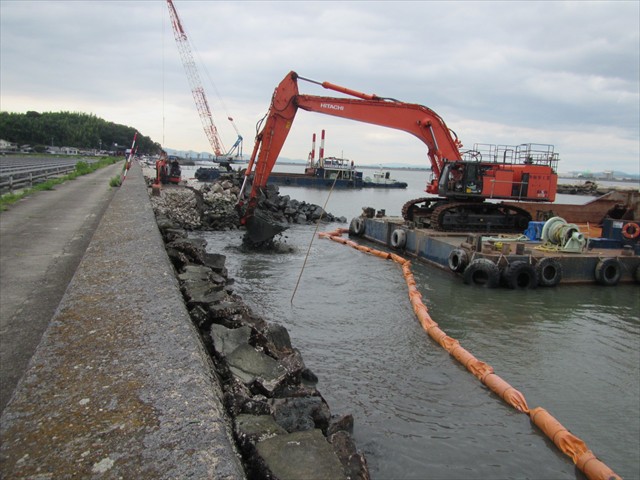 (バックホウ台船にて掘削)